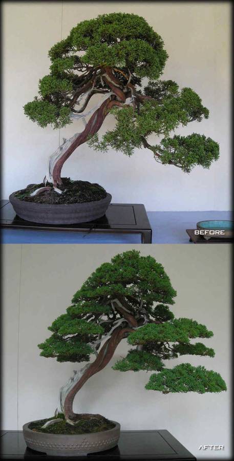 интересно, какой стиль у этого дерева? Наклонный? Литературный? Интересно, очень необычно и... красиво. Мне нравится. Только интересно, если бы кто-нибудь на форуме имел такой бонсай, не предложили бы ему обрезать как-нибудь, или отвести верхнюю часть? Ведь в верху очень толстые ветки. Да и ствол не очень сбежистый, и есть обратная сбежистость. И у этого мастера много безумных деревьев :). На первый взгляд (не профессиональный), он нарушает иногда правила бонсай. Как и в любом деле, наверное работает правило, что нужно сначала изучить каноны, чтобы потом осознанно, мастерски их нарушать.