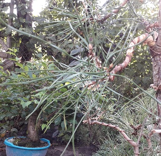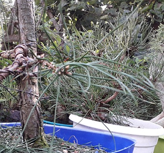 Самое первое с чем хотелось бы поделится, это пересадка. Первые две сосны из песка, последняя - суглинок. Была еще одна сосна из суглинка, я не выдержал и формировал ее в том же сезоне. Как результат, после возвращения с отдыха (хоть в ОГ, но не поливалась 10 дней), она погибла, как и еще две сосны из песка (эти не формировались). Итого, из семи осталось четыре. Все семь сосен копались с комом максимально аккуратно, все прижились и все дали свечи, позже молодые веточки. Погибшая формированная сосна демонстрировала лучший прирост. Таким образом, тезис об одной серьезной операции для сосны за сезон, для себя считаю подтвержденным. Как в "Разрушителях мифов" - confirmed. (Но, после распускания свечек, все же проводил прищипку самых длинных и сильных на свежепересаженных соснах). Но вернемся к пересадке. В этом году снова привез 7 сосен, из песка. Посадил с родным комом в ОГ. Одна имела чуть хуже вид по хвое изначально, желтоватая. Поливал регулярно, но последний раз в воскресенье пять суток назад; эти пять суток могут мне стоить желтоватой сосны, свечи ослабли, не вытягиваются, некоторая хвоя легко опадает. Так что после пересадки даже в ОГ нужно следить за влажностью грунта. ОГ не должно расслаблять, после пересадки его структура нарушена, и влага легко теряется.