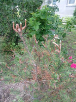 Обнаружила, что на всех соснах хвоя слишком сочная, большая ( я бы даже сказала жирная) и опадает при любом прикосновении. Повторюсь ситуация наблюдается на всех соснах ( сильвестрис, муго, черная вастрийская). Думаю, что это результат избытка удобрений. Получилось так, что примерно месяц назад внесла гранулированные удобрения слишком щедро и пошли обильные дожди. В результате удобрения растворились слишком быстро, и деревья единовременно получили супердозу. Во всяком случае другого объяснения я не нахожу.
