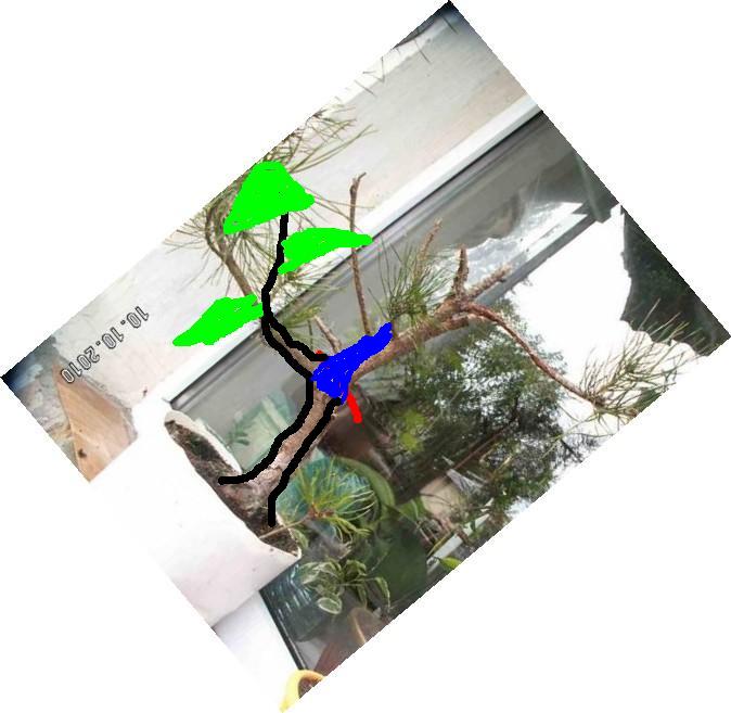Вот сходу вариант: Первая левая ветка становится продолжением ствола, гнется в 2-х точках узлов, из старого ствола джинн позаковыристей, меняем угол посадки, все. Дальше работаем с бывшими вторичными, ныне скелетными ветками в узлах и формируем макушку.