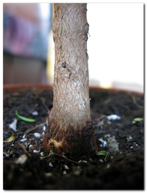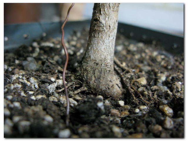 Вот обещанные фото основания дерева (и оно само по состоянию на сегодняшний день ) Если есть хоть малейшие шансы, что дерево перенесет пересадку и отводка не понадобится, я буду его пересаживать, так как хочу сохранить расширение ствола при основании На сегодняшний день высота деревца где-то около 22 см., толщина ствола в нижней части - 12 мм., ширина основания от корня с медной проволокой слева до тонких корней слева - 24 мм. С одной стороны ствола корни расположены выше планируемого мной основания и я хотела их удалить.