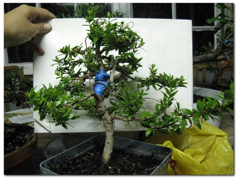 Мирт действительно оказался не очень капризным В прошлом году он был перевален в универсальный грунт с кварцевым песком. Летом у него бодро отрастали корни и часть из них показалась у дренажных отверстий, но потом в результате погодных катаклизмов отмерли. Осенью я побоялась пересаживать растение, отложила все на весну. Зима в этом году наступать не спешила, поэтому мирт засыпал очень неохотно, а состояние корней ближе к весне уже оставляло желать лучшего, поскольку на молодых листочках начали появляться небольшие округлые лиловые пятнышки. Недавно я все же решилась его пересадить. Некоторые корни оказались немного поврежденными, но довольно много было молодых здоровых тоненьких корешков. Корневой ком удалось "распотрошить" полностью, остатки стаканчика из спанбонда тоже удалены. Корни практически не подрезала (боялась реакции на пересадку ), только те, что требовали этого по медицинским показаниям. Корни обсыпала растолченной таблеткой гетероауксина. Дерево поместилось в китайский керамический горшок, грунт пролила фунгицидом. Я уже говорила, что с лицевой стороны не хватает ветвей, там и поверхностных корней оказалось маловато. Так что пляски с бубнами будут нужны не только для того, чтобы пробудить спящие почки на стволе... Прошло где-то около 2-х недель