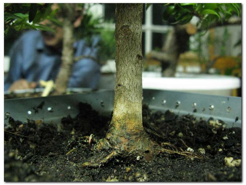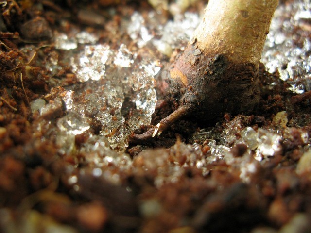 После пересадки мне не давала покоя мысль, что летом на солнце будет сильно пересыхать верхний слой грунта у корней и я могу потерять молодые тонкие корни, предназначенные для формирования будущего небари. Поэтому я аккуратно сняла верхний слой грунта и выложила на них слой гидрогеля (размер гранул M) и засыпала субстратом. Идею такого использования гидрогеля когда-то подсказала в чате Наташа, которая видела на выставке мирт с красивыми поверхностными корнями, полученными таким образом. Примерно через месяц после того как в грунт был добавлен гидрогель я посмотрела что там и как. Целью было не праздное любопытство, просто дерево начало показывать признаки устойчивого роста, а поскольку корней с одной стороны ствола не было, то я немного повредила кору и опудрила стимулятором с целью стимулирования роста на этом участке. Все опять укрыла гидрогелем и субстратом. Надеюсь, что пока не очень жарко, корни смогут немного окрепнуть и уже не будут так уязвимы от действия высоких температур летом.