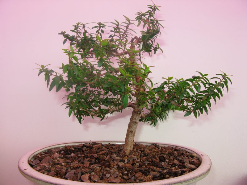 Я проредила ветви в верхней трети деревца и наложила на некоторые из них проволоку. Мне очень не нравилась довольно толстая ветвь с предполагаемого фронта, отходящая от ствола под некрасивым углом, который я бы не смогла исправить. Поэтому, не смотря на то, что она там нужна, я ее удалила. Правая толстая ветвь (из двух, расходящиеся вилкой из одной точки и практически равных по толщине стволу), мне не нравились тоже, поэтому она была подрезана до молодого побега, появившегося ближе к стволу. До и после обрезки Потом, поскольку я оставила правую толстую ветвь в покое, я сняла со ствола обмотку. Как позже выяснилось - зря . К августу мирт стал напоминать мне маленькое деревце, даже стволик немного поправился. Я наконец-то выбрала время для обмотки проволокой ветвей, но попытки изменить угол наклона правой толстой ветви потерпели фиаско. На не политом растении мне удалось ее согнуть в нужное положение, но тут зашло солнце, а света как раз не было и я не сразу заметила, что она надломилась. Подсветив мобильным телефоном политое растение я увидела, что еще немного и я останусь без нее... Растяжку пришлось снять, а ствол обмотать изолентой. На фото видна трещина на ветви и практически заживший за лето шрам на верхней задней ветви. Выправлять ветви, выросшие в определенном положении, на таких растениях, как мирт, очень тяжело... Мне, по крайней мере, поскольку новичкам хочется все сделать красиво сразу, и быстрее приблизится к образу идеального дерева... а так не бывает Ветвь прижилась, оставшийся целым камбий обеспечил транспортировку воды и минеральных веществ , но на этом злоключения мирта не закончились, поскольку буквально через неделю пострадала еще одна ветка. С ней тоже вроде бы все обошлось, но изоленты на стволе прибавилось Сейчас мирт отличается от представленного на последнем фото тем, что я придала форму и подрезала верхушечный побег, чтобы растущие на нем чахлые веточки, которые раньше росли в середине кроны чупа-чупса, начали развиваться. Также уже снята обмотка с самой правой нижней ветви, которая растет свободно без обрезки (она отросла от ствола - т.е. выращена за лето с нуля. Всего таких ветвей на дереве три). Толстая ветка, растущая над ней подрезана до пары листочков.