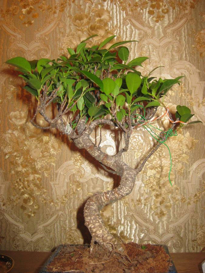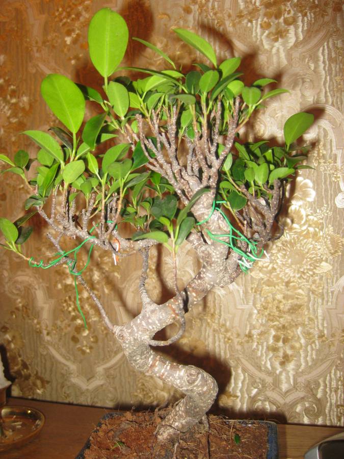 Vladik777, снимите проволоку. Фикус следует адаптировать к своим домашним условиям (почитайте здесь), поливать следует по мере просыхания верхнего слоя порядка 1 см. Кстати такой фикус довольно живуч. Удачи