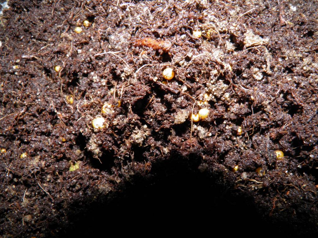 Решил сделать перевалку и обнаружил внизу под корнем большое количество желтых шариков размером с гречку. При надавливании лопают, внутри белесоватая жидкость. Кто знает что это?