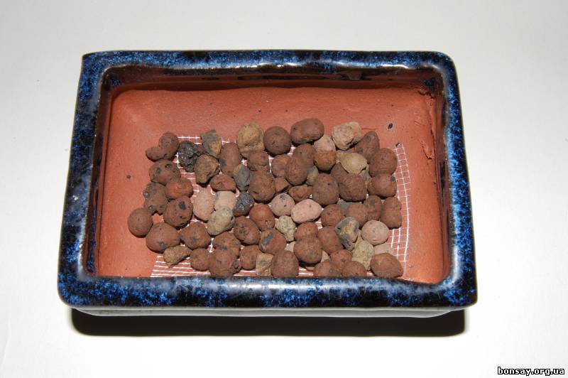Поскольку песок в качестве дренажа начал просыпаться через сетку, решил заменить его керамзитом. Сделал выборку из имеющегося керамзита на более мелкую фракцию. Сразу засыпал в плошку.
