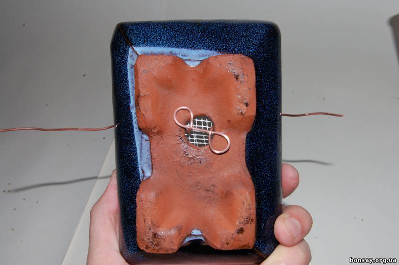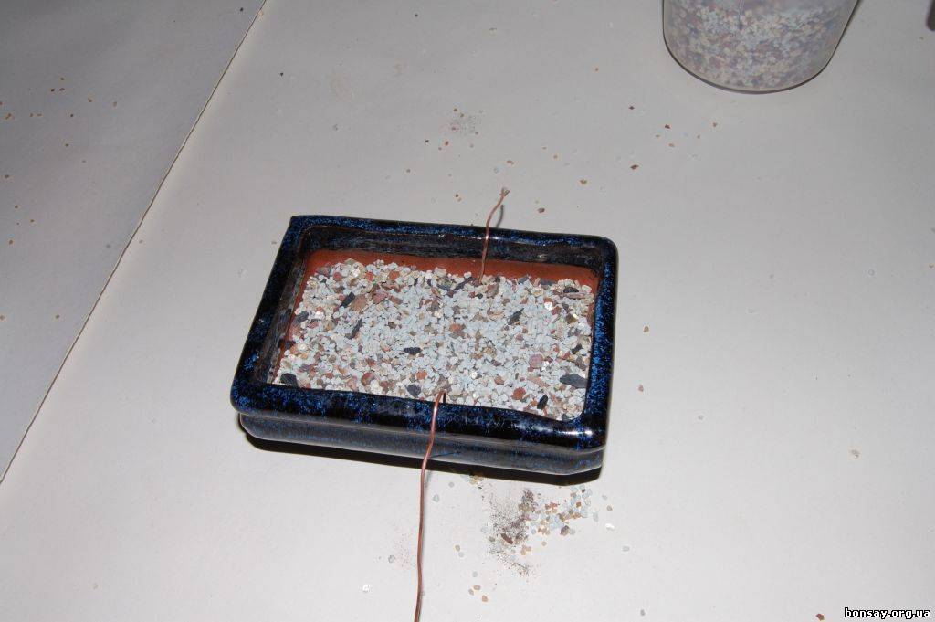 ... И вспомнил что забыл продеть проволоку для крепления деревца. Прокалил на элетрокомфорке медную проволоку на 1,5 кв., тщательно стер с нее всю окалину, сделал бабочку, поскольку специальных дырок в плошке нет. Продел свозь засыпанное, но некрасиво получилось - дренаж вылез поверх субстрата. Пришлось все высыпать, отделять дренаж и начинать сначала.