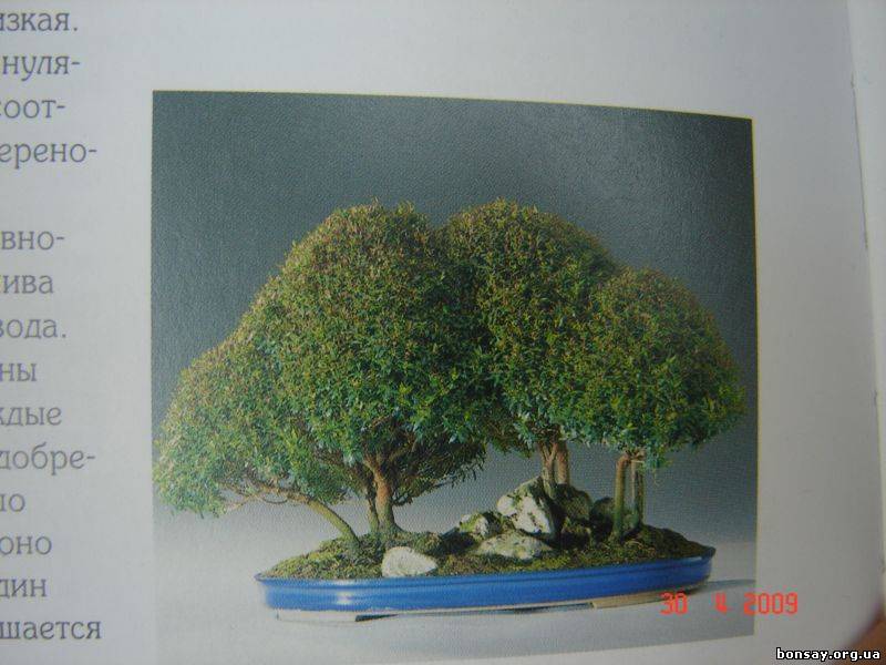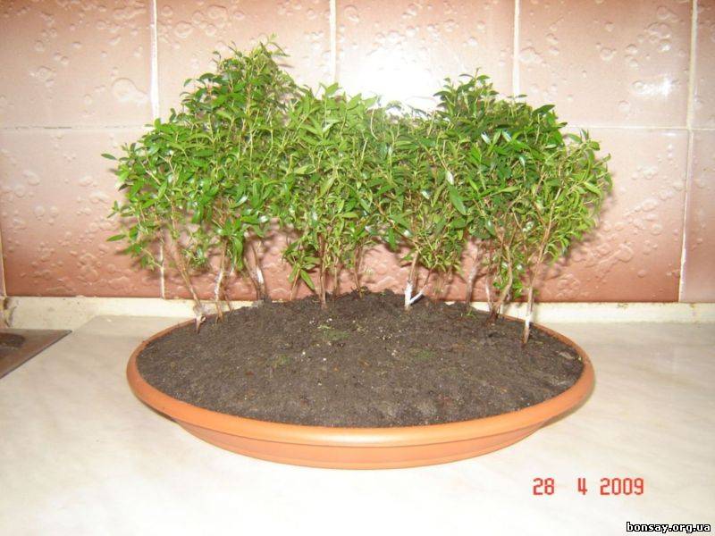 Роща планируется в услових верхнего освещения? Я это к тому, что при боковом (окно, лоджия) почти неизбежно затенение части ветвей, и как следствие, облысение. Такая роща, как на образце, для мирта, по-моему, возможна только в теплице или при уличном содержании (например на балконе верхнего этажа). При боковом свете добится устойчивого слияния крон для мирта сложно (если не применять досветки или отражателей, естественно).